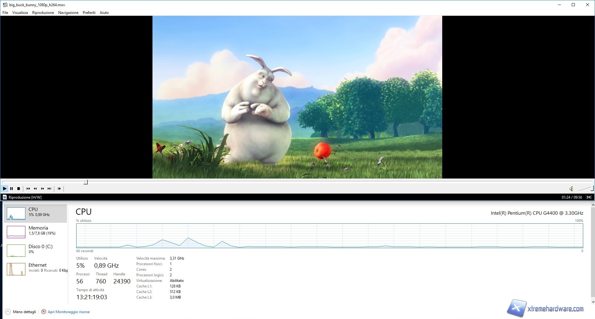 Notiamo come la riproduzione è stata eseguita con una percentuale di carico per la CPU di 10% e frequenza di 1,9GHz durante la riproduzione del filmato in FHD con codec H.264 mentre siamo passati alla totale saturazione durante la riproduzione del video in 4K con codec H.265 avvertendo anche notevoli scatti. Ovviamente e come vediamo in questo caso abbiamo avuto un utilizzo del 99% alla frequenza massima di 3,28GHz. Notiamo altresì che per una riproduzione in altà qualità e alta risoluzione, come può essere un video o film in 4K con codec H.265, il Pentium G4400 non garantisca alcun valido risultato almeno con il software VLC. Infatti per controprova abbiamo utilizzato il software Media Player Classic chiamato anche MPC-HC e possiamo vedere come tutto sia cambiato. La riproduzione del file con codec H.264 ha restituito una percetuale di utilizzo del 5% con una frequenza di 0,89GHz mentre passando al file, con cui abbiamo avuto grossi problemi con VLC, abbiamo avuto valori di utilizzo del 45% con una frequenza di 3,25GHz. Comprendiamo dunque come in questo caso il Pentium G4400 offra valide prestazioni e i problemi sono stati causati da un problema software e non hardware. Consigliamo dunque agli utenti di utilizzare il software MPC-HC al posto di VLC, almeno per il momento.